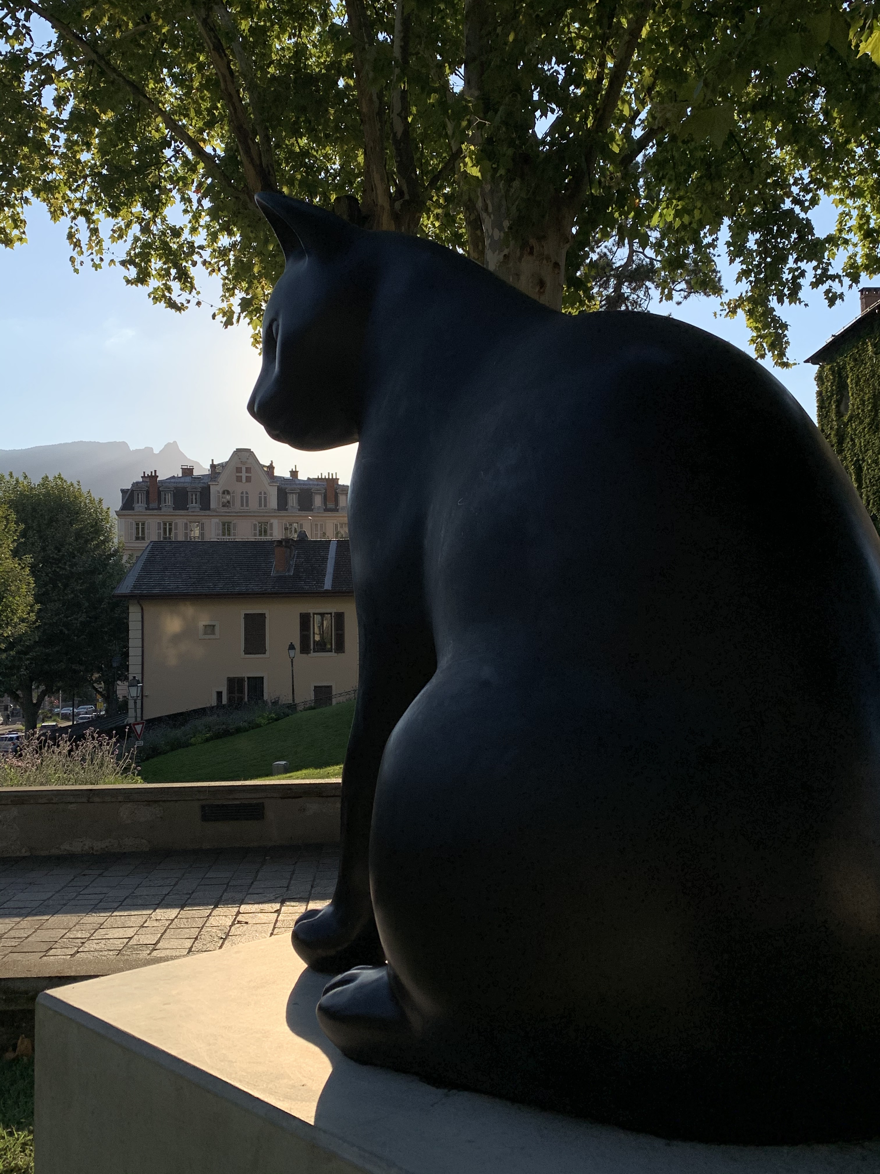 Elle fait l’événement, c’est la p’tite dernière de la collection acquise par la Ville d’Aix et inaugurée en septembre 2020. Un chat, une première pour celui qui l’a façonné : Michel Bassompierre, sculpteur nantais habitué des animaux plus sauvages. Regard tourné vers le Mont du Chat, le Chat fait face à sa légende – celle de la Dent du Chat. Le contraste est total avec l‘imaginaire du félin féroce celui qui selon la légende, sème la terreur dans le village du pêcheur. Sa posture alerte en fait un défenseur tout naturel Voilà qu’un chat protecteur conjure le sort du chat dévastateur.
