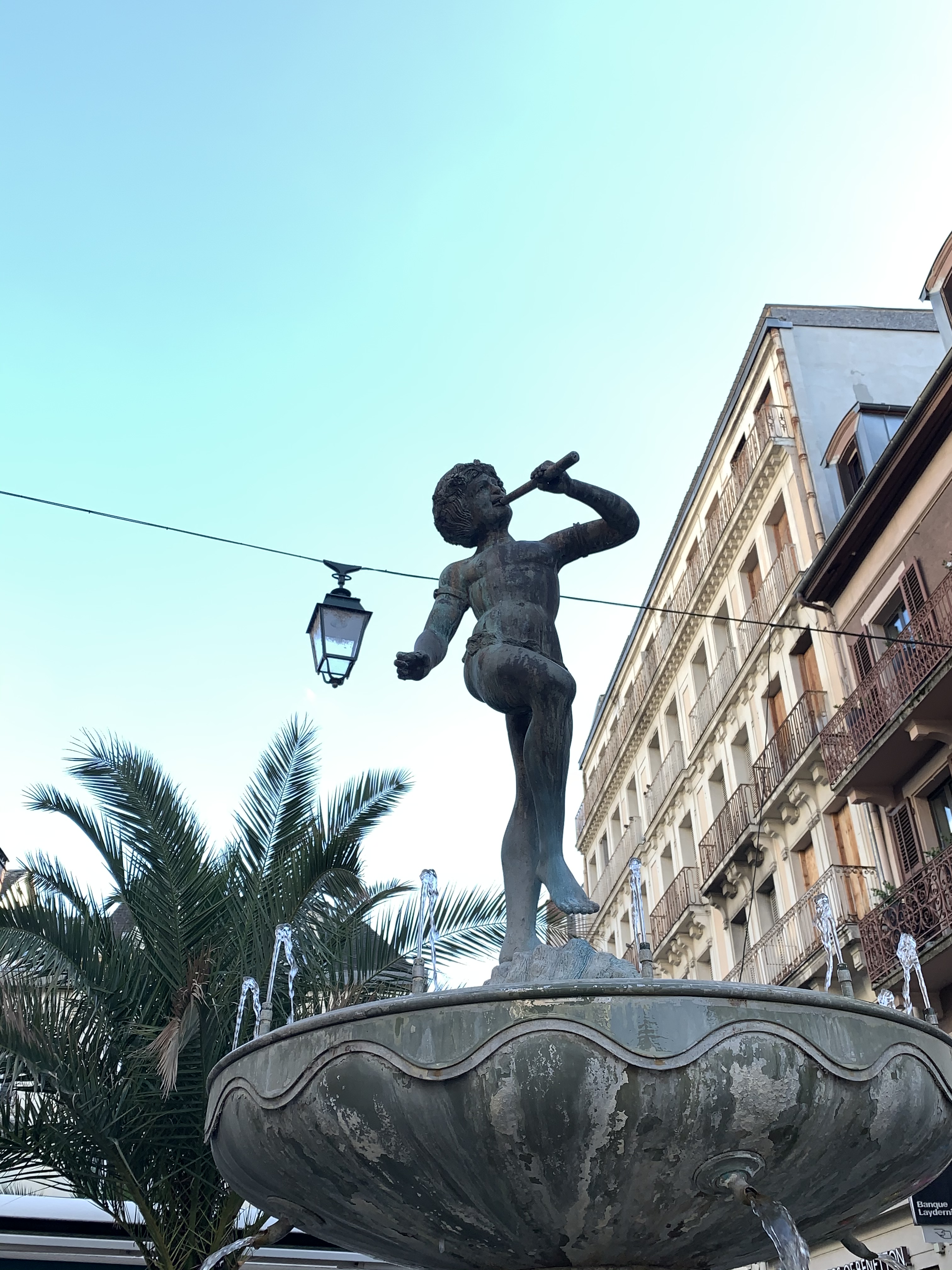 On n’y prête peu attention à ce petit joueur de flûte qui surplombe la fontaine de la place Carnot. Celle-ci a été dessinée en 1982 par l’architecte aixois Pierre Rault. Du haut de son piédestal, il voit défiler bien des badauds déambulant dans la vieille ville. Ne vous laissez pas amadouer par son air enfantin, le musicien nous vient de loin. Acheté auprès d’un antiquaire, il a putsché en 1994 une statue féminine. Pour quelles raisons, nous l’ignorons …