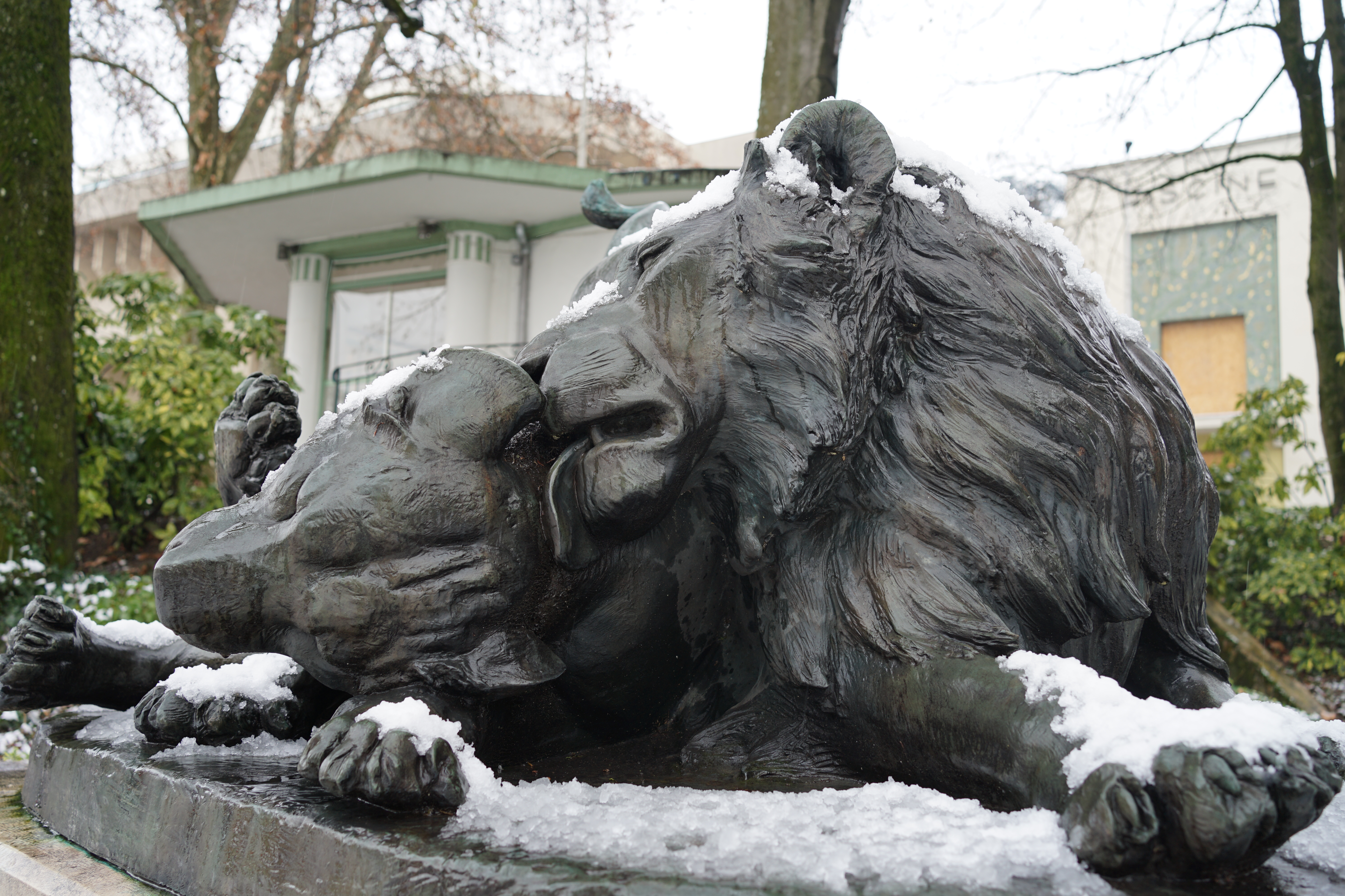 Attendrissant ce câlin entre le lion et sa lionne ou l’inverse. Il nous vient de 1889 et n’a failli pas passer le cap du XXIème siècle car enlevé il y a 80 ans pour être fondu pour les besoins de la Seconde guerre mondiale sur décision d’une commission nationale. La statue de bronze sculptée par A.V Geoffroy-Déchaumé a été enlevée mais jamais fondue. Alors qu’il neige, qu’il pleuve, qu’il vente, qu’importe pour ce couple de rescapés qui put retrouver le Parc thermal après-guerre. A contrario, l’épreuve de l’ouvrage appartenant à un privé a été dérobée en 2019.