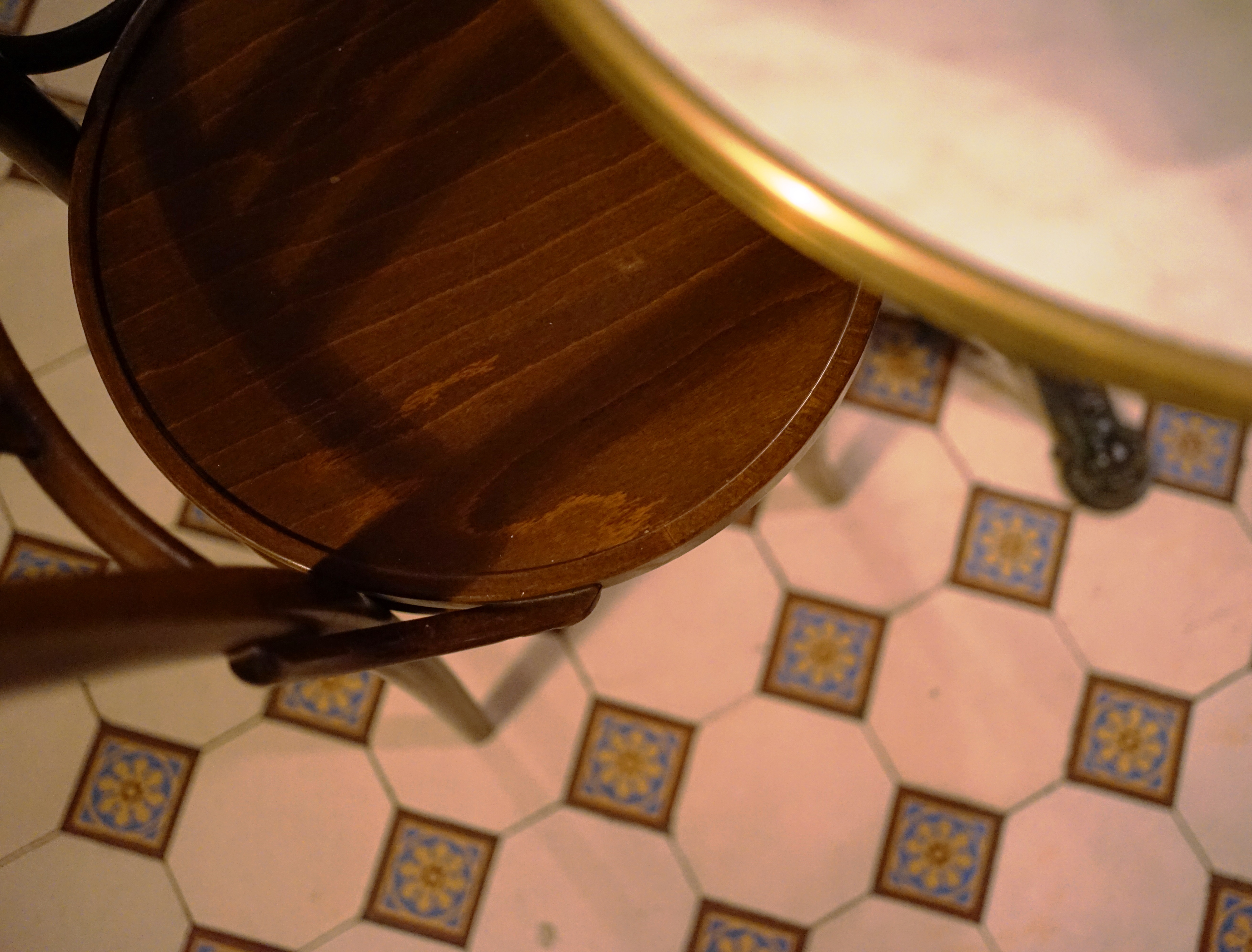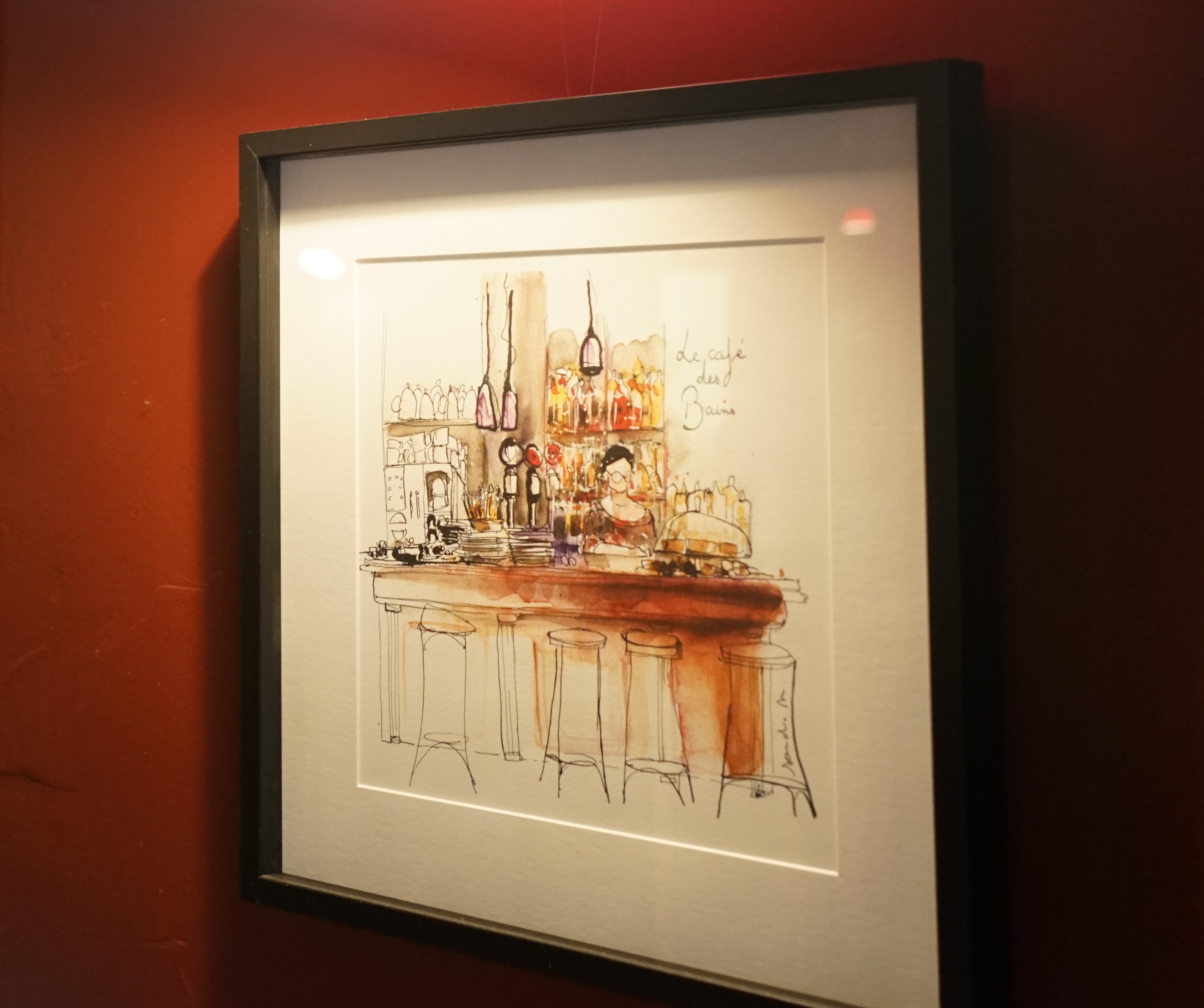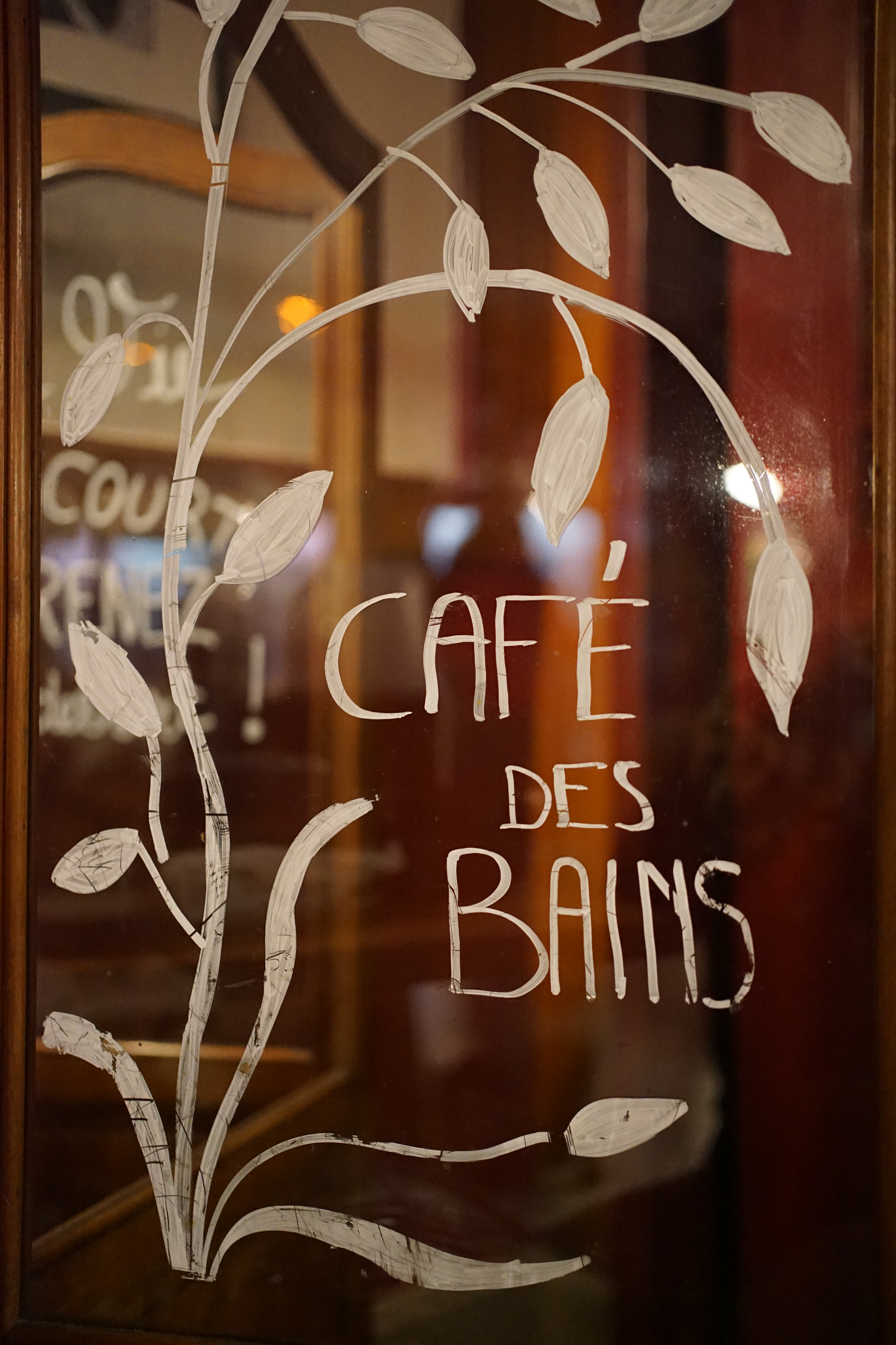 Au Café des Bains, il y a mille saveurs d’antan à reconquérir. Cela commence par cette poignée qu’on ne saurait saisir autrement qu’avec tact, pour passer l’entrée et sa devanture entièrement vitrée et stylisée Art Déco. Un geste simple qui donne déjà la mesure du temps. Tout comme ces carreaux en ciment au sol ou l’authentique comptoir recouvert de zinc, fidèle témoin de l’ouverture de ce « bistrot » fin XIXème siècle, toujours orné d’un beau bouquet. Nous voilà figés ou presque entre ces murs d’un rouge foncé pénétrant. La collection de journaux et revues à feuilleter pourrait rappeler à notre époque.