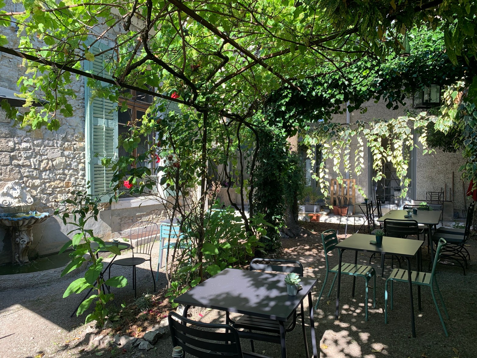 Alors cette terrasse ? Pour vous y installer, dirigez-vous vers l’arrière-boutique, passez la porte vitrée. Vous voici à l’ombre de la pergola où s’entremêlent les lianes de vigne vierge, les feuilles et grappes d’une vielle vigne, frôlant quelques roses et les longues tiges d’un kiwi.