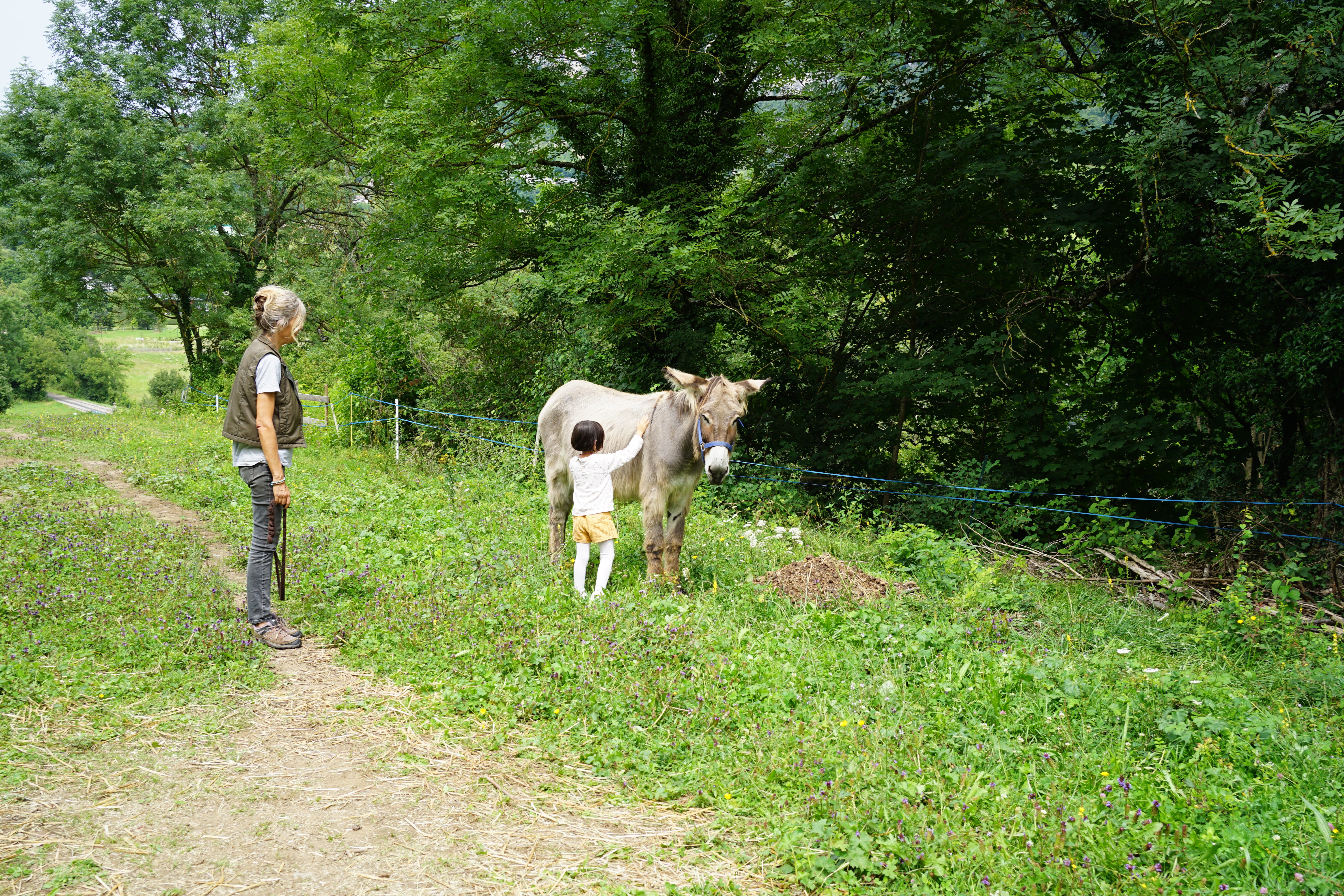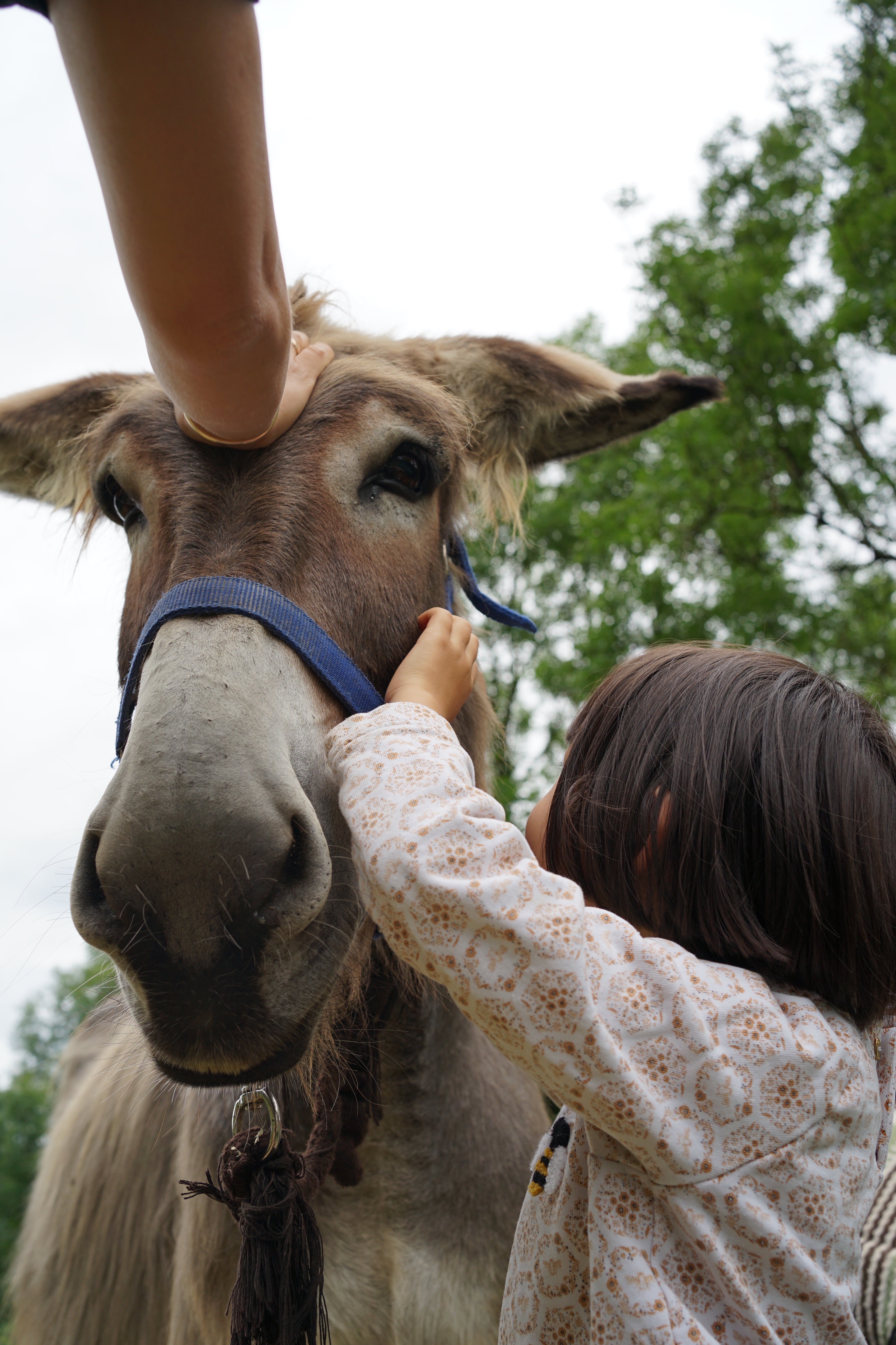 A chacun leur caractère. L’âne n’est pas un cheval à grandes oreilles. Il a son tempérament. Titus, 20 ans, âne des Pyrénées, adore le contact des enfants, qui viennent le brosser, l’équiper et le chevaucher pour un tour de pré. Lui c’est le bosseur. Coyotte, plus jeune, croisé âne Baudet de Poitou/Provence se fait plutôt discret, en dépit de sa grande taille, et n’approche pas à pas que les enfants calmes et réservés. Si vous parvenez à le caresser, c’est une petite victoire de remporter sur sa timidité.