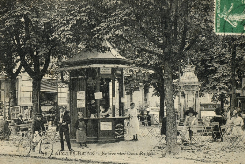 C’est du royal séjour des Reines de Hollande que sera inspiré le nom de la source exploitée par la Société des Hôtels et domaine des Corbières. Placée face aux Thermes en pleine effervescence, la buvette de la Source des Deux-Reines est aussi à deux pas de la pharmacie tenue par Pierre Folliet, également actionnaire de la Société. A l’époque, Aix vit au rythme des initiatives privées. Par la suite, une société d’embouteillage se développe, et utilise l’image des deux reines sur les étiquettes. (Plus d’infos ici)