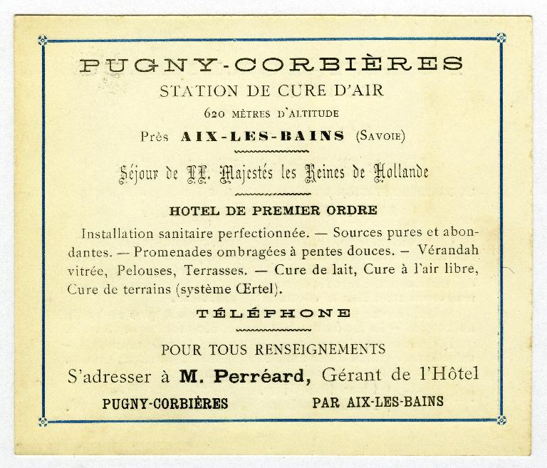 L’ex-hôtel des Corbières s’érige encore fièrement au pied du Revard, orienté plein sud pour se prêter aux exigences de l’héliothérapie alors très en vogue à la fin du XIXème siècle. L’aventure financière échoue très vite, en dépit de l’illustre éjour des Reines de Hollande, sur lequel le Docteur Monard et ses actionnaires tente de capitaliser pour rebondir. En vain.