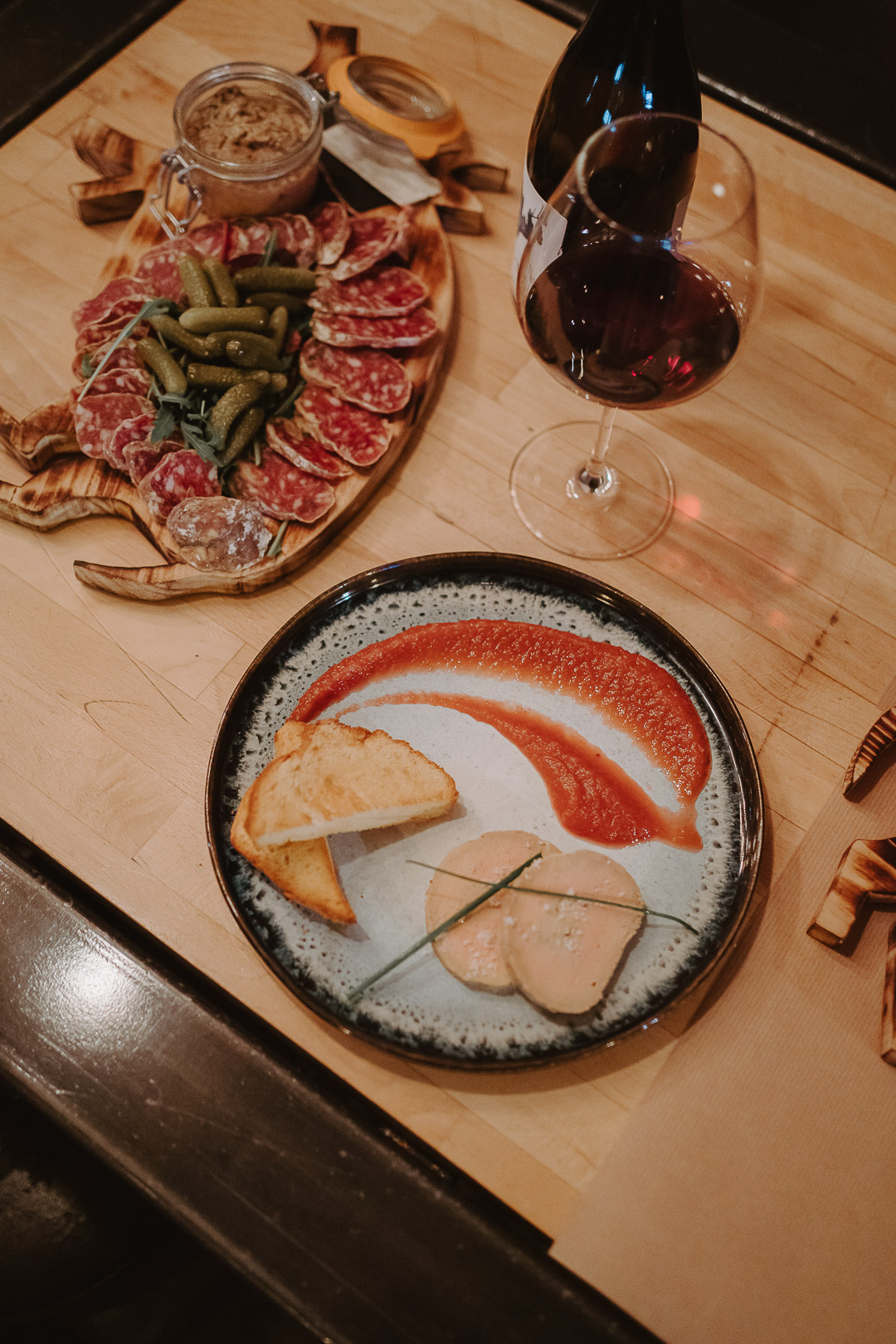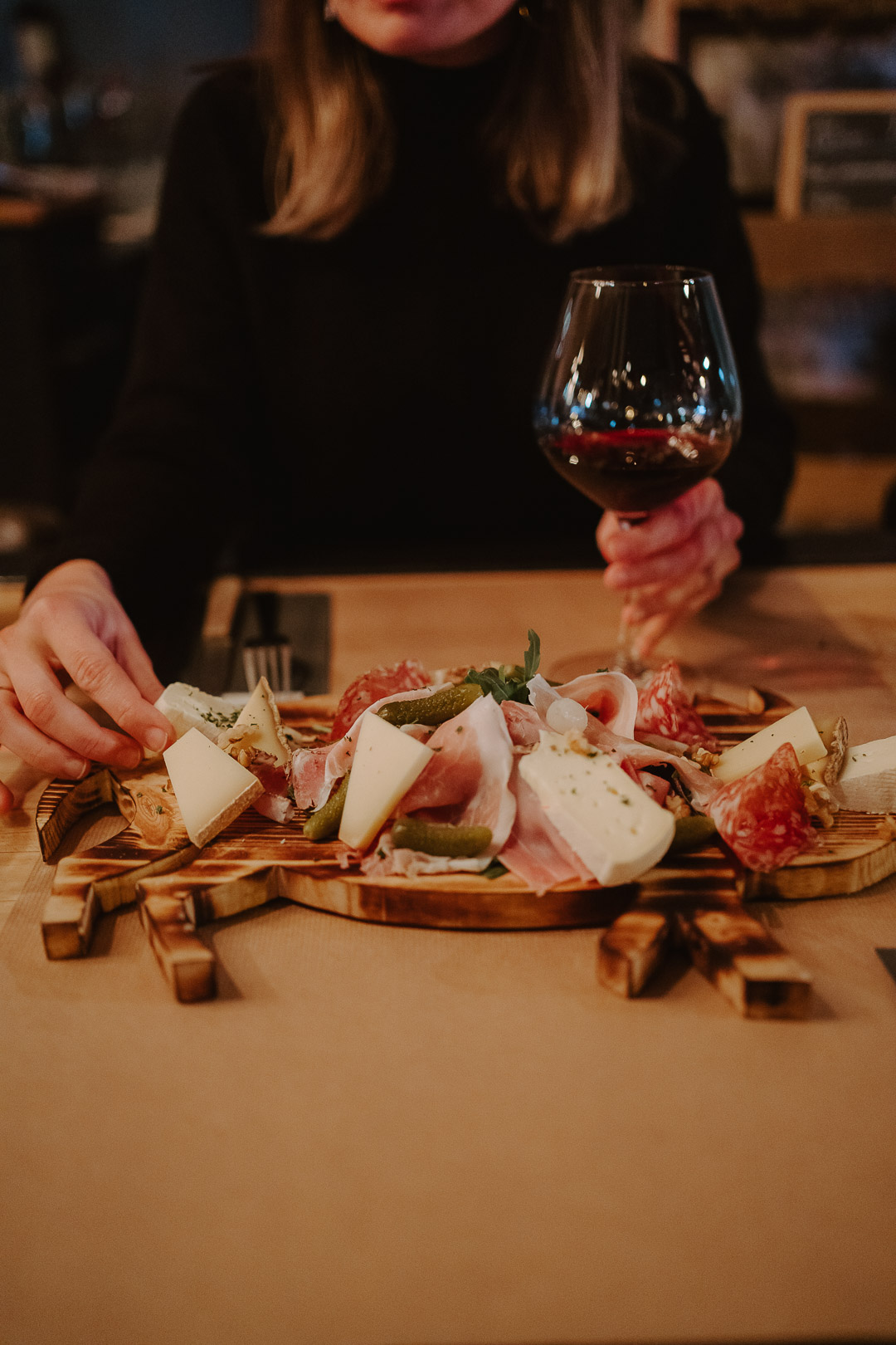 Pour accompagner l‘apéritif autour d’une belle planche de fromages bien de chez nous et d’un fabuleux jambon Ïbaima de Louis Ospital, on se laisse conseiller contre toute attente un verre d’une puissante Mondeuse noire (2017) du domaine Saint-Romain.