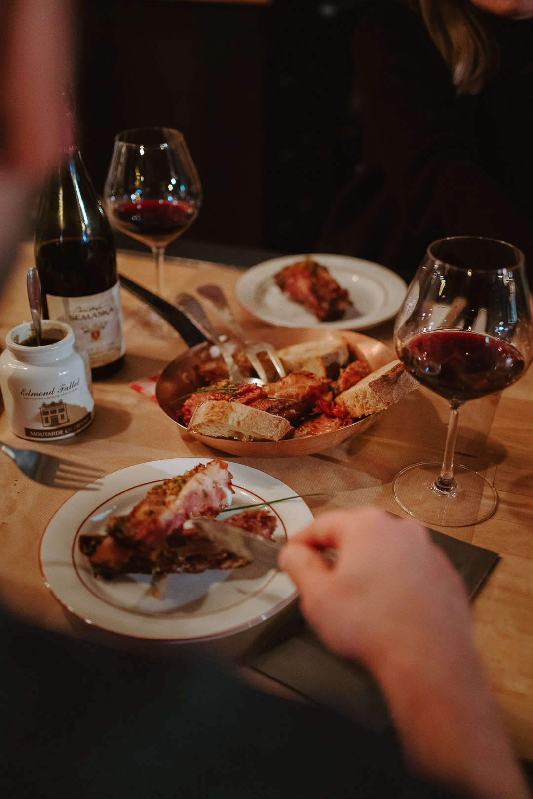Allez, finie la récréation, on passe aux choses sérieuses. On hésite avec les gnocchis de Marco. Mais le chef nous fait part de sa suggestion : le couston de porc, confit à la graisse de canard, servi en cassolette pour deux personnes. On frôle le reportage de Gueuleton là les gars ! D’emblée, arrive à table un pot de moutarde à l’ancienne de chez Fallot, l’une des dernières maisons mourtadières de Bourgogne.