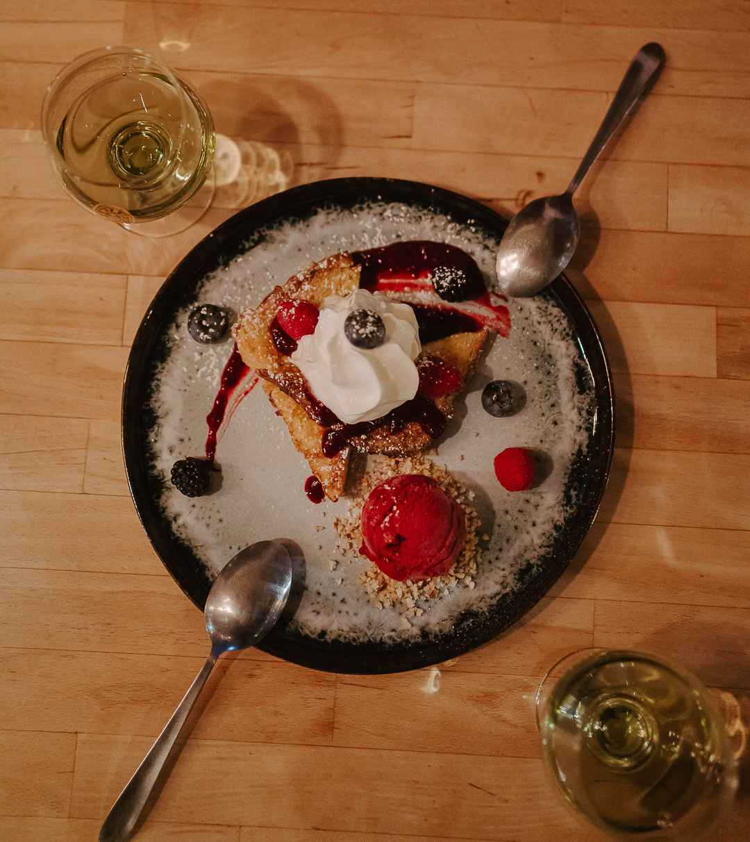 Il vous reste bien une place pour le dessert ? Indécises, nous laissons le choix au chef. Voilà que s’invitent à la table un Panettone façon pain perdu, travaillé en subtilité pour faire ressortir une note fruitée, et une copieuse crème brulée sous nos yeux à la Chartreuse verte. Le spectacle est au rendez-vous. Encore une belle manière de revisiter les grands classiques. Bravo Maestro !