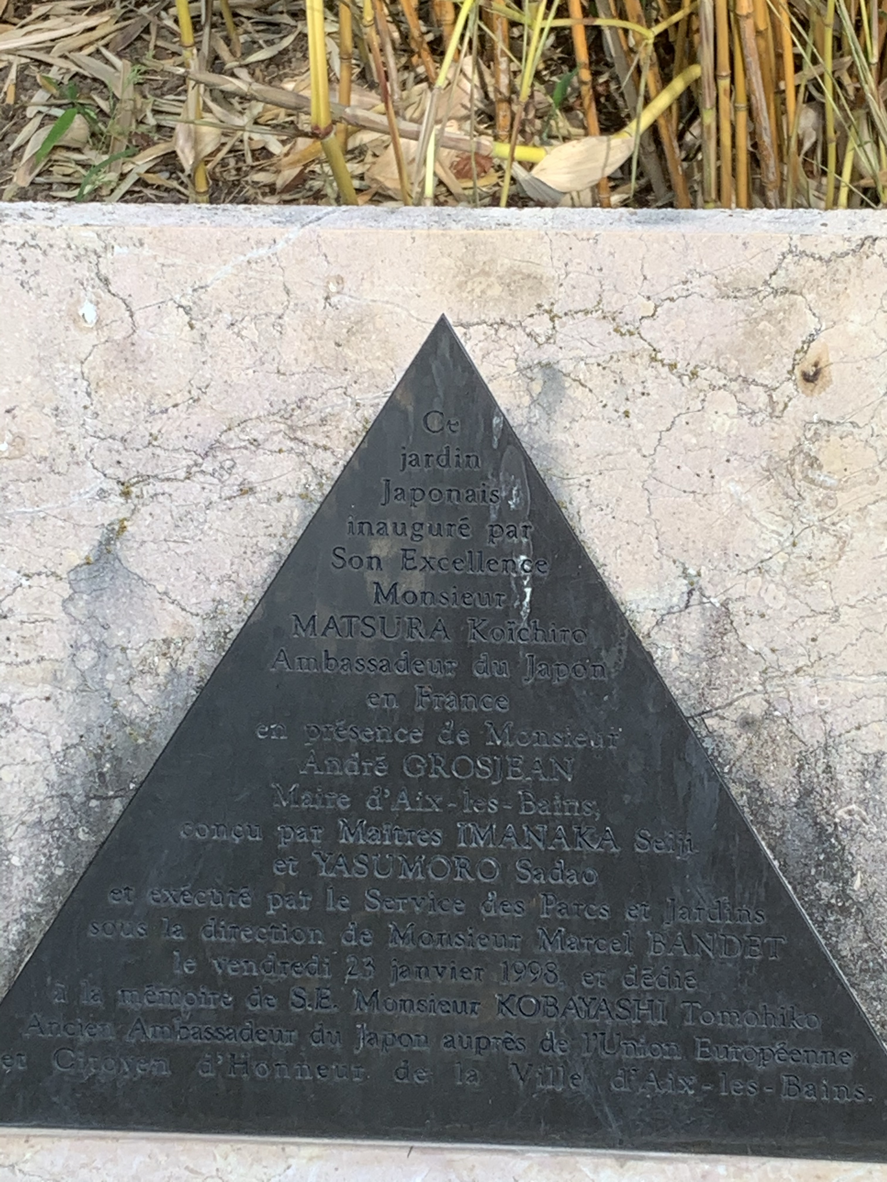 Créé en 1998 – année du Japon en France (souvenez vous de l’attachement de Jacques Chirac à la culture nipponne !), le Jardin japonais a été voulu par Tomohiko Kobayashi diplomate et ambassadeur du Japon auprès de l’Union européenne, installé par la suite à Aix-les-Bains (Chantemerle) pour sa retraite. Fait citoyen d’honneur de la Ville, il décéda malheureusement avant de voir ce jardin réalisé.