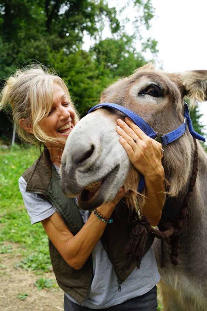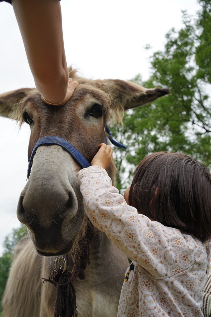 A chacun leur caractère. L’âne n’est pas un cheval à grandes oreilles. Il a son tempérament. Titus, 22 ans, âne des Pyrénées, adore le contact des enfants, qui viennent le brosser, l’équiper et le chevaucher pour un tour de pré. Lui c’est le bosseur. Coyotte, plus jeune, croisé âne Baudet de Poitou/Provence se fait plutôt discret, en dépit de sa grande taille, et approche pas à pas de préférence les enfants calmes et réservés. Si vous parvenez à le caresser d’entrée de jeu, c’est une petite victoire de remporter sur sa timidité.