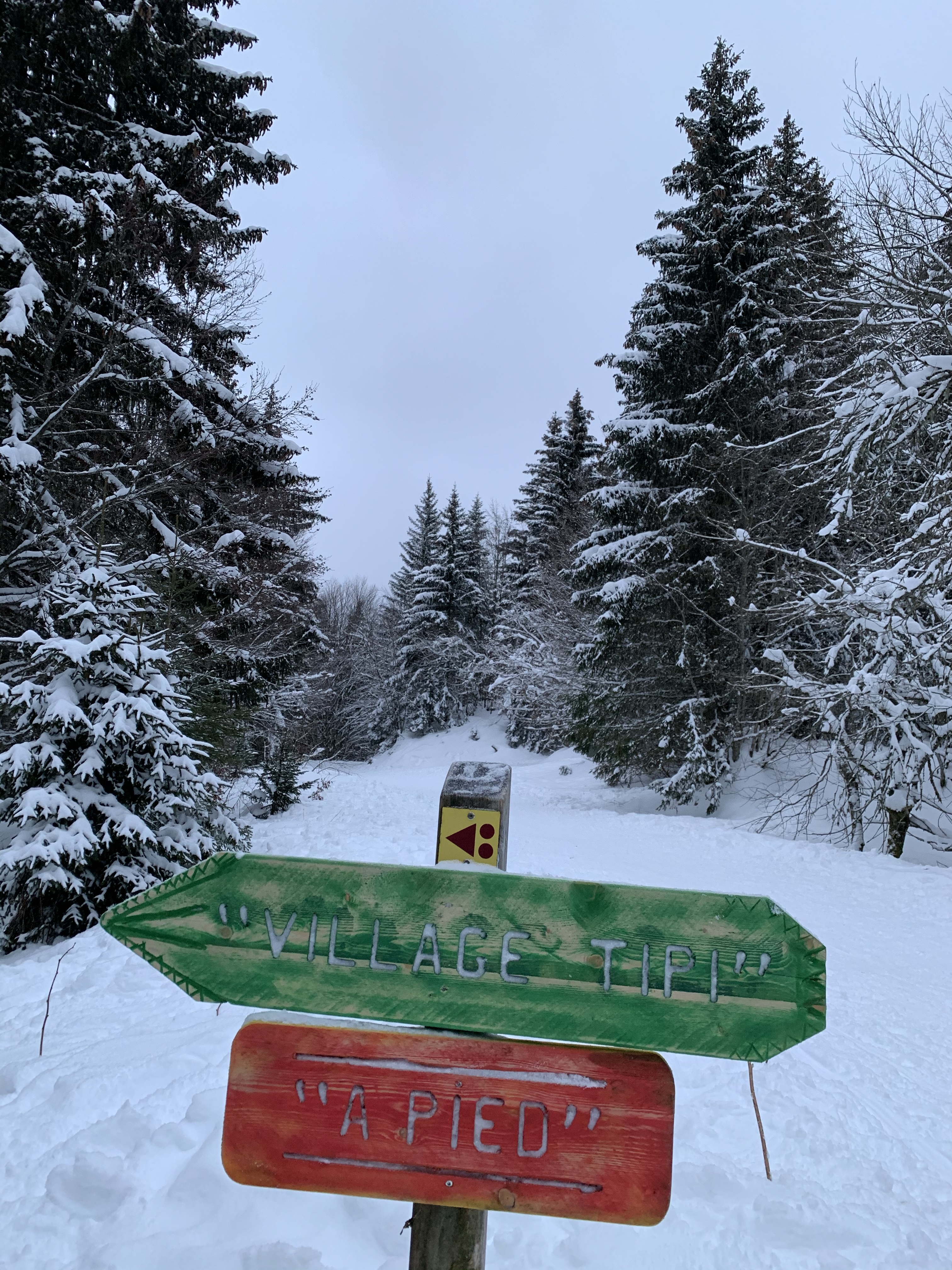 A quelques pas de la route départementale qui mène au Revard, on chemine à pied ou en raquettes sous les bois pendant 5 à 10 minutes depuis un parking balisé, et hop ! Vous voici aussitôt plongé(e) dans un tout autre univers : celui du Village « tipi ».