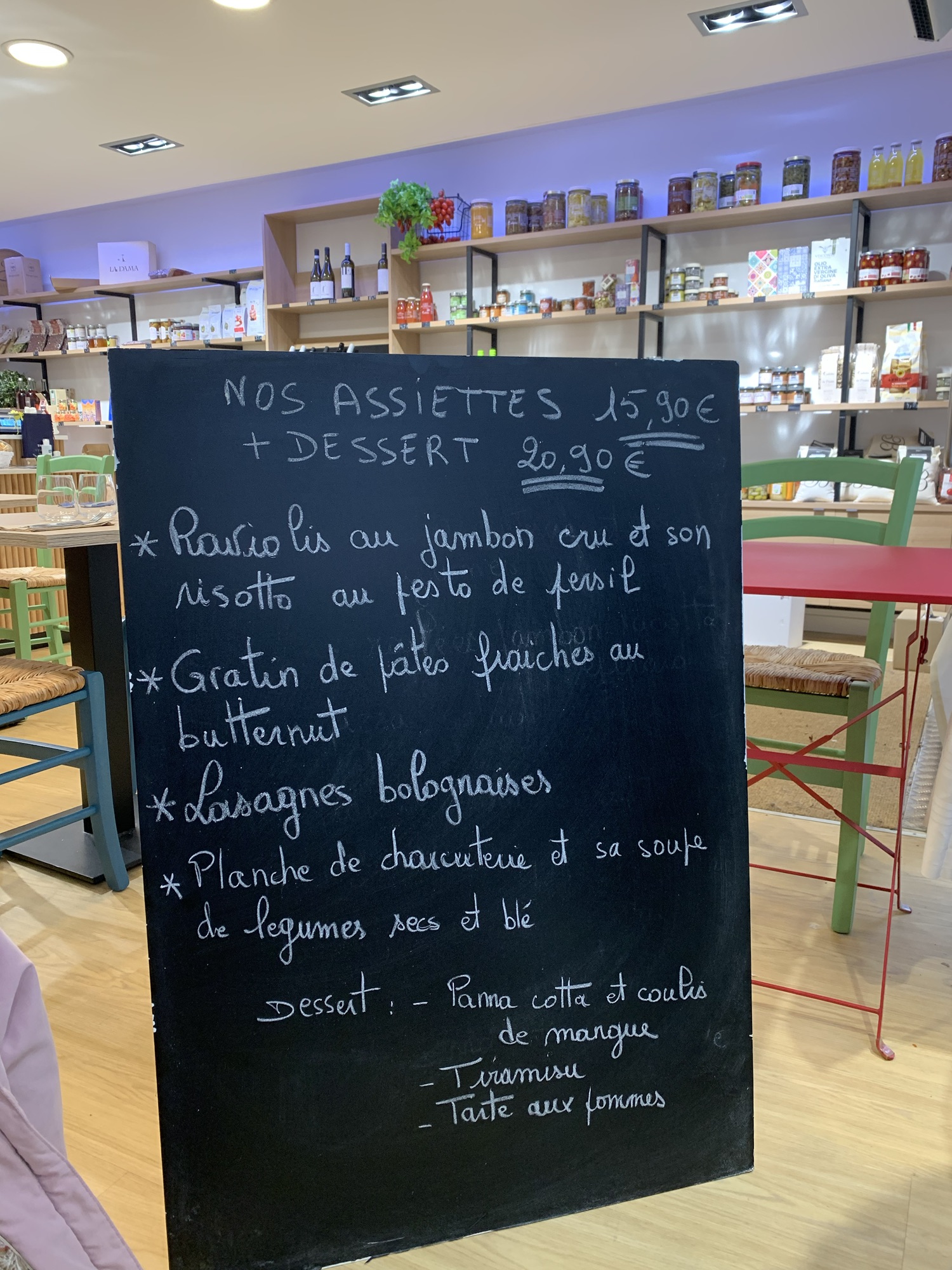 La Trattoria est aussi ou avant tout une épicerie fine, où retrouver d’authentiques produits italiens, tels que le Parmigiano Reggiano, de l’huile d’olive, des gressini …
