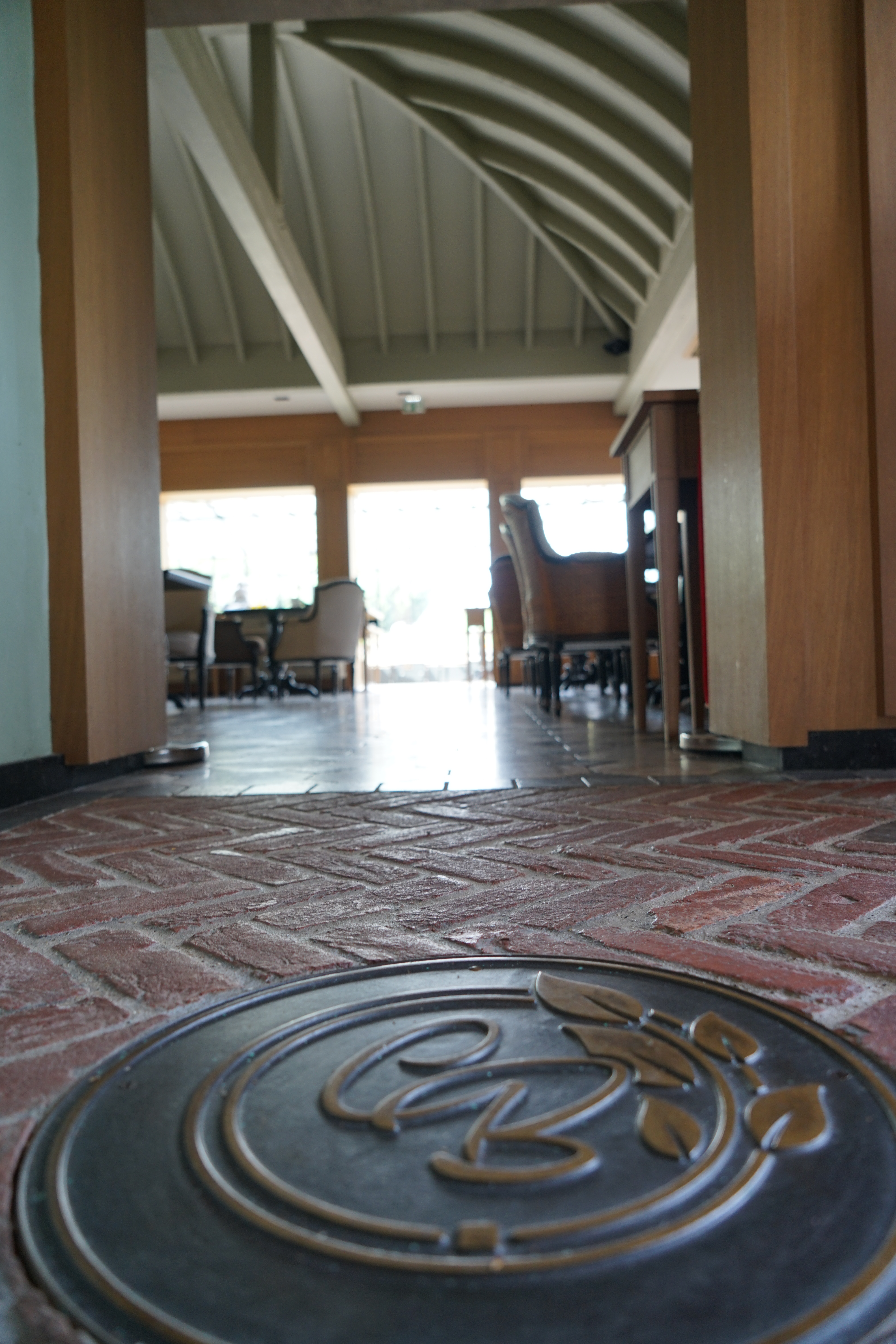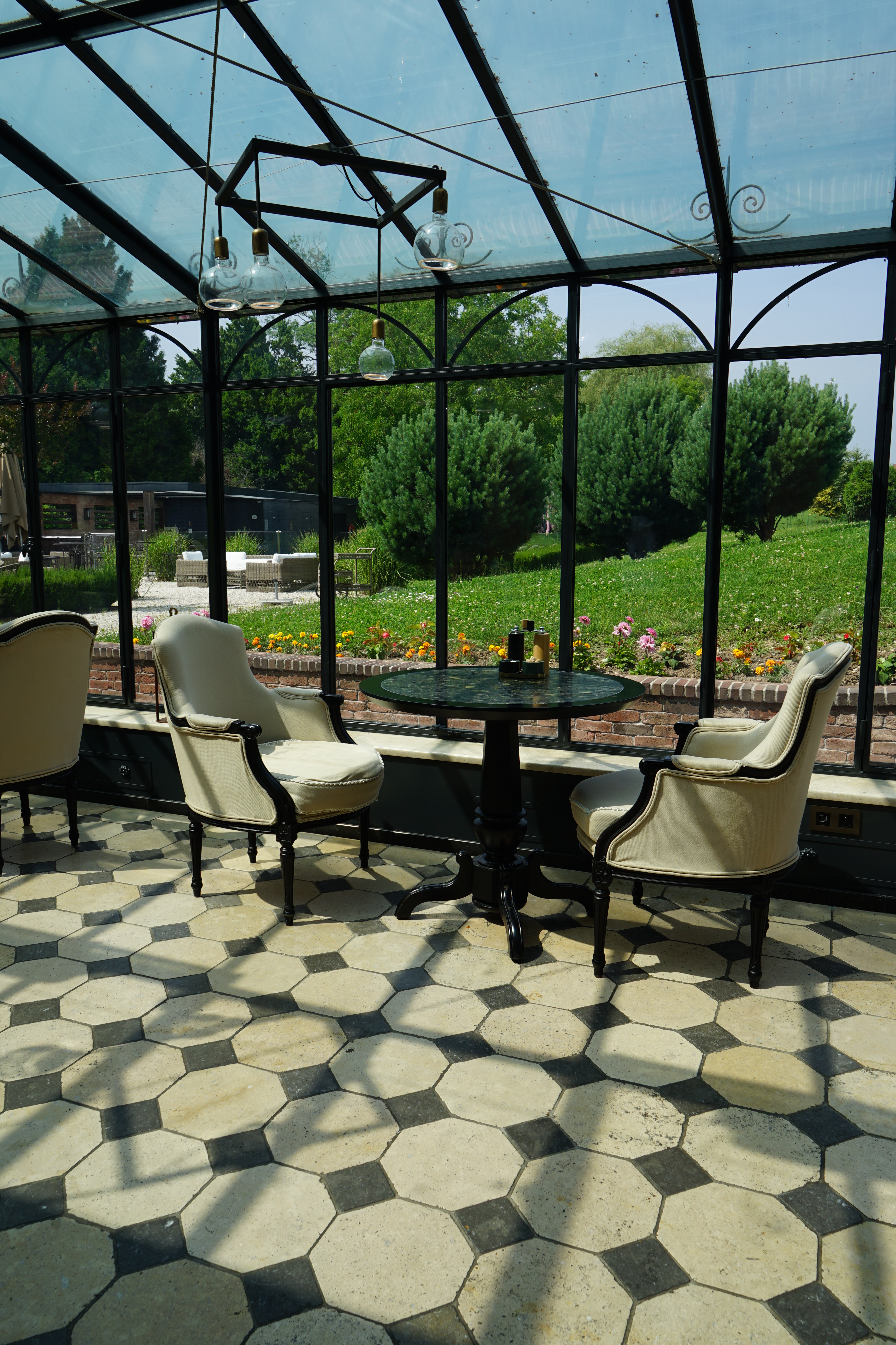 Entrons par la réception, l’ambiance est feutrée. Empruntons un couloir habillé d’une sérigraphie à l’effigie du maitre des lieux : Dr Léon Brachet himself ! Au sol, une démarcation faite en briques rouge indique que là s’arrêtaient les murs de l’ancienne bâtisse. La voici dotée d’une extension ouverte sur les jardins du parc, par l’entremise d’une verrière forgée dans l’esprit « Belle époque ». Autant de témoignages du maître des lieux à la faveur de l’histoire. C’est là que se trouve la salle du restaurant.