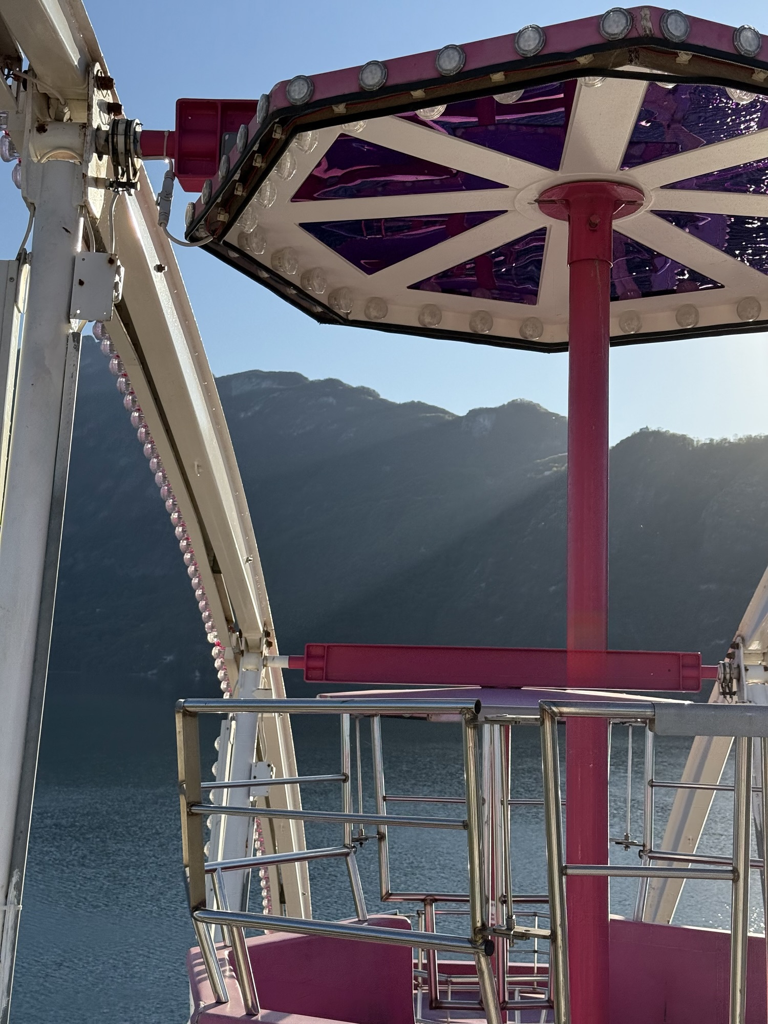 Certes, la Grande roue semble bien sage comparée au reste des attractions de Méga Park, qui pour la plupart s’adressent aux accros d’adrénaline. La Grande roue s’inscrit dans la tradition des fêtes foraines, et marque à Aix-les-Bains, le retour du printemps. Un moment où la ville change de rythme, où l’on prend le temps, où l’on retrouve une forme de légèreté – dans le contexte de Mégapark, certes assez électrique. Au fond, cette grande roue symbolise tout ça : prendre de la hauteur, regarder autrement… et savourer l’instant, loin du tumulte d’ici-bas.